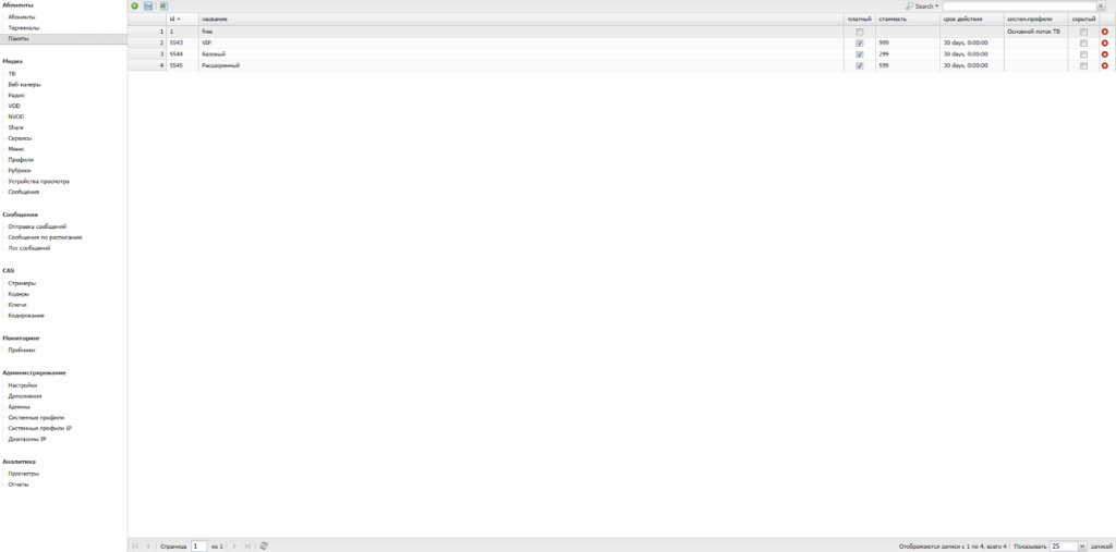 В разделе представлен функционал для управления пакетами услуг, предлагаемых абонентам.
