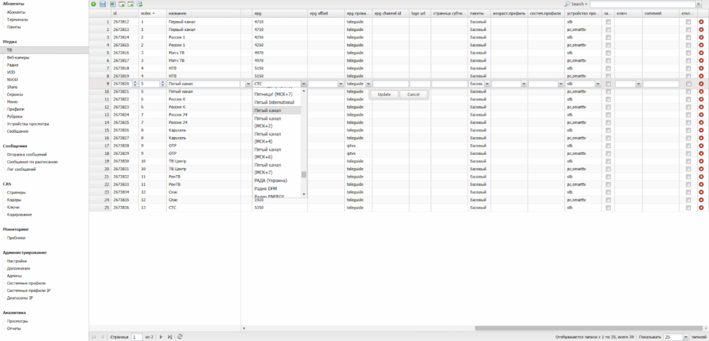 Раздел предназначен для добавления телевизионных каналов и управления их параметрами.