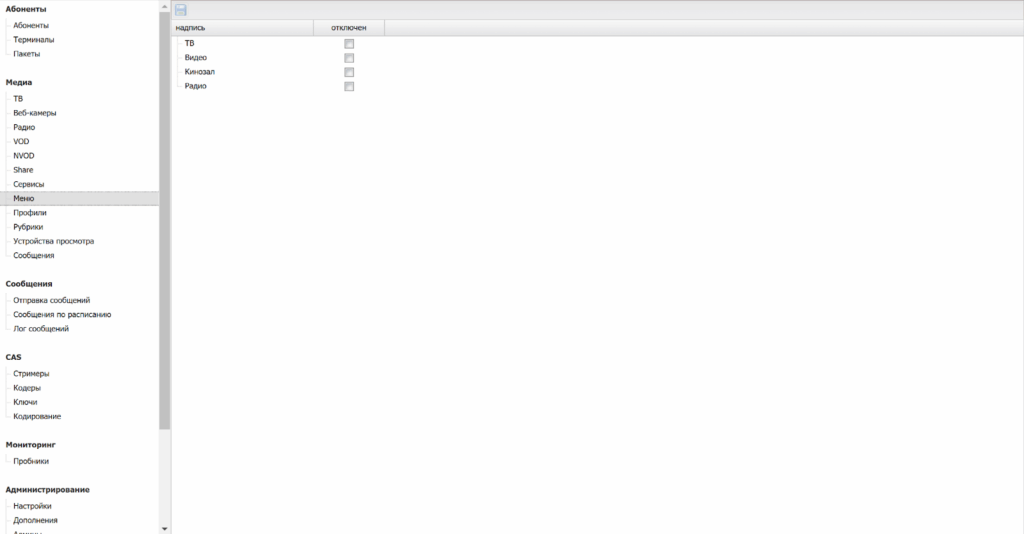 | Отображать в меню недоступные медиаресурсы | Если ВКЛ, то недоступные медиаресурсы будут отмечены замком и отображаться в абонентском интерфейсе в конце списка (в рамках назначенного системного профиля Абонентам/Терминалам). |