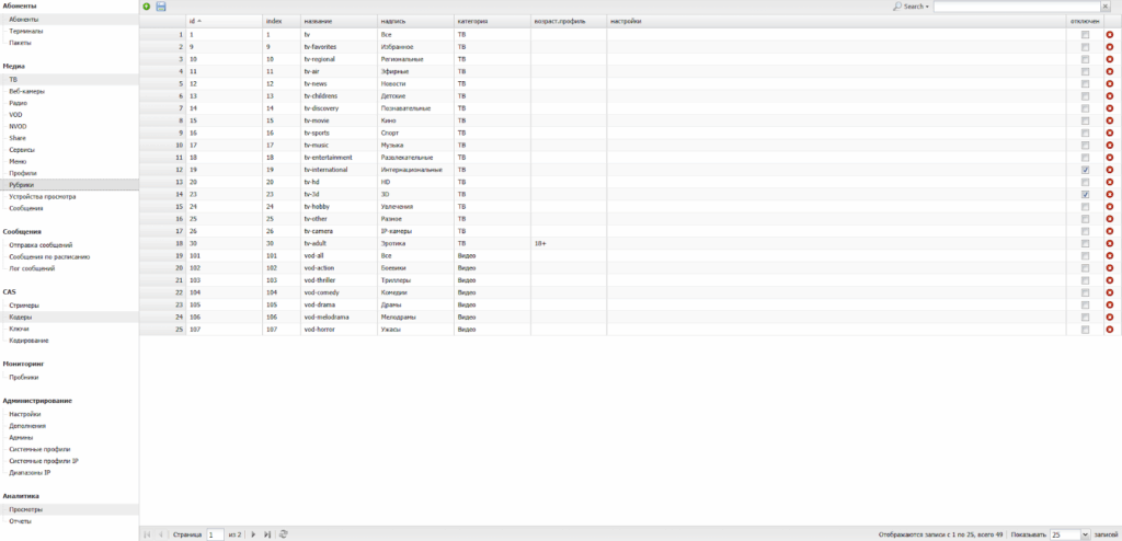 | Использовать сквозную нумерацию ТВ каналов | Если ВКЛ, то номер канала в абонентском интерфейсе будет соответствовать номеру канала в панели администрирования (поле Index), а также канал можно будет включить из любой рубрики набрав на пульте номер канала. Если ВЫКЛ, то каналы в абонентском интерфейсе нумеруются в каждой рубрике отдельно. |