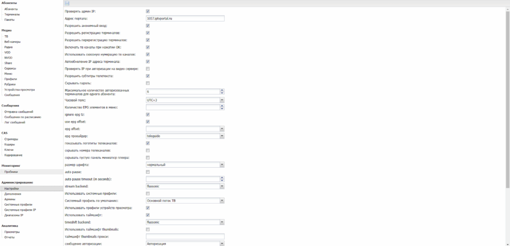 | Timeshift backend | При выборе типа используемого стримера для timeshift (flussonic, astra) запросы контента будут идти по API этого стримера (указывается для более правильной работы контента). |