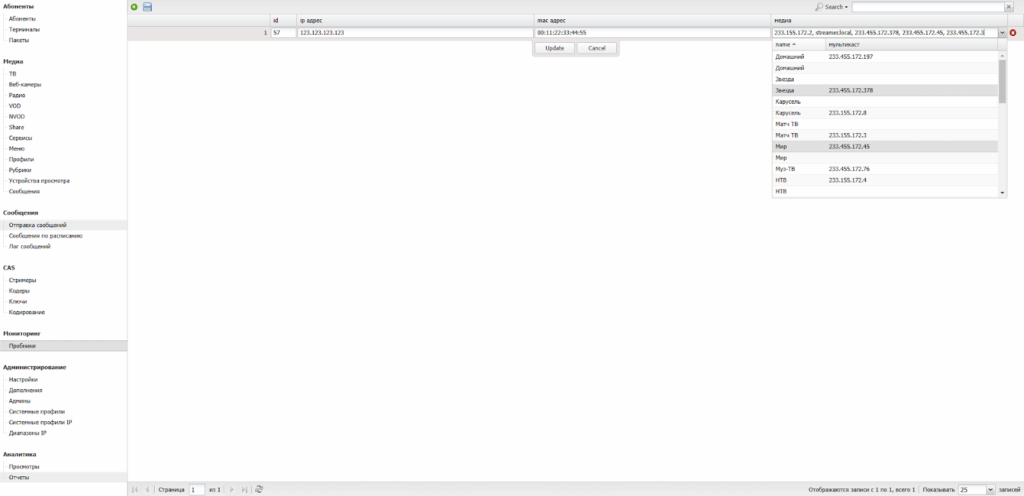 Данный раздел предназначен для контроля качества мультикастовых потоков на узлах сети. Работает только после установки софта для мониторинга качества телевидения на сервер оператора.