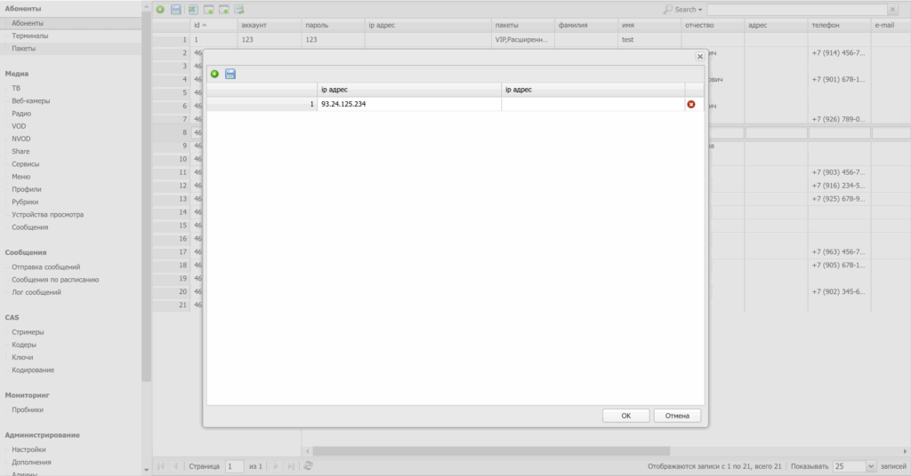 - В разделе Абоненты административной панели укажите диапазон IP-адресов (или один IP-адрес) абонентов в соответствующем поле.